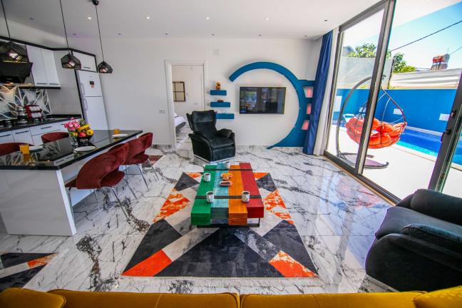 Villa Vişne 2 Özel havuzu tam korunaklı villamızdır. Geniş ve ferah bir şekilde tasarlanan villamız, balayı misafirlerimiz ve aileler için çok ideal bir seçenektir. Otopark bölümünün olması ve doğa manzarası özellikle misafirlerimizin ilgisini çekecektir.