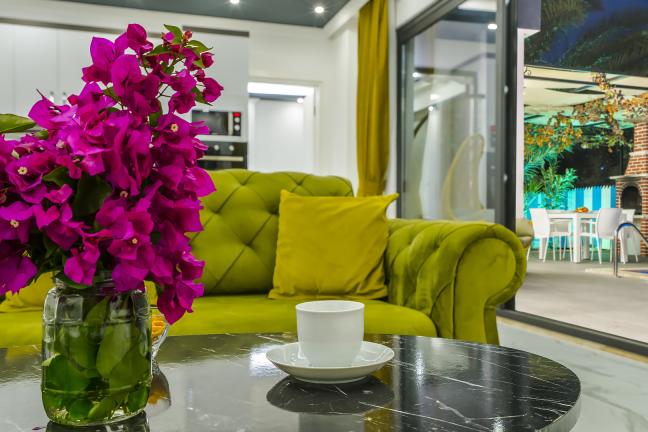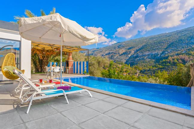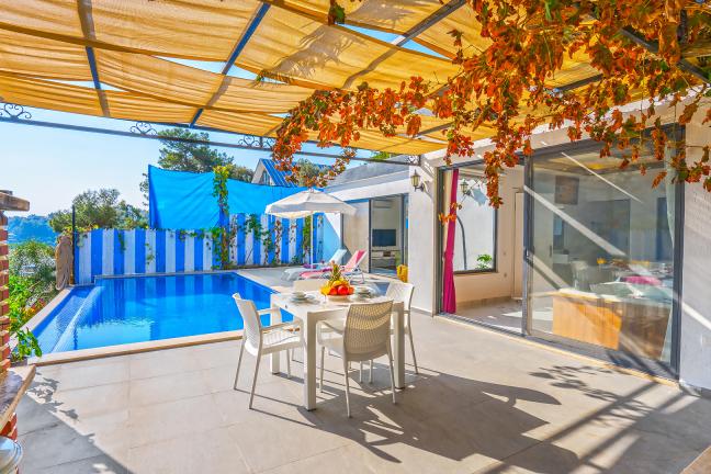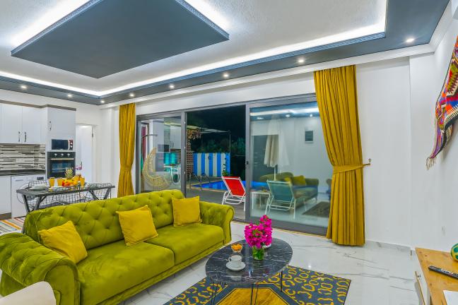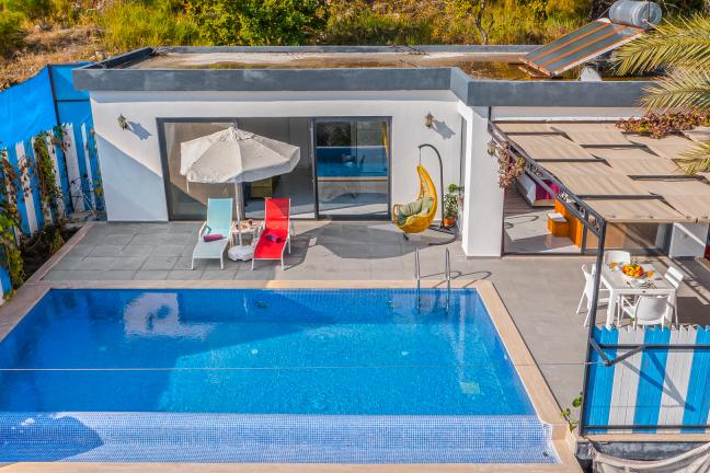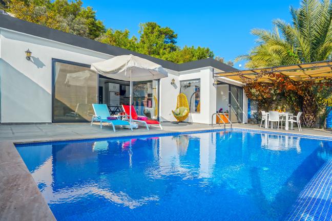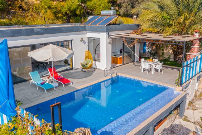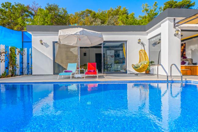 Villamızın genel konsept ve özelliklerinden tekrar bahsedecek olursak; villamızın 1 adet müstakil özel havuzu bulunmaktadır. Ortalama bir bahçeye sahip olan villamız rahatlığı ön planda tutan 1 adet yatak odası, 1 yatak, 1 banyo, hareket alanı geniş bir mutfak ve 2 kişinin geniş aralıklarla rahatlıkla oturabileceği koltuklara sahip salonu bulunmaktadır.