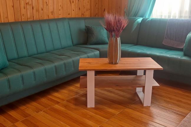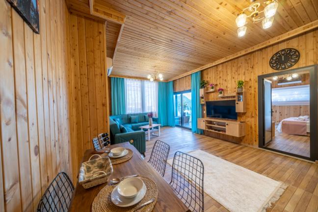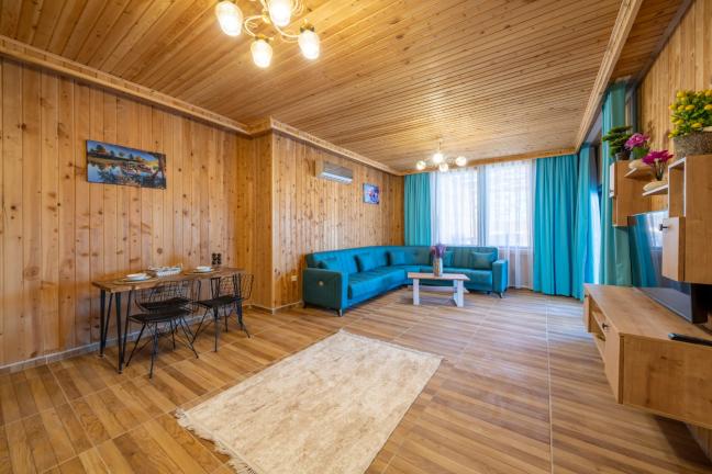 Salon Detayları: LCD TV, modern oturma grubu, yemek masası ve sandalyeler, kablosuz modem bulunmaktadır.