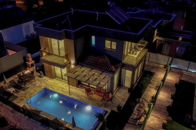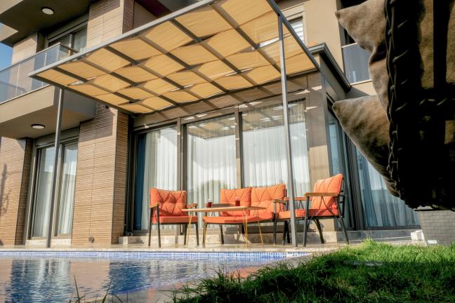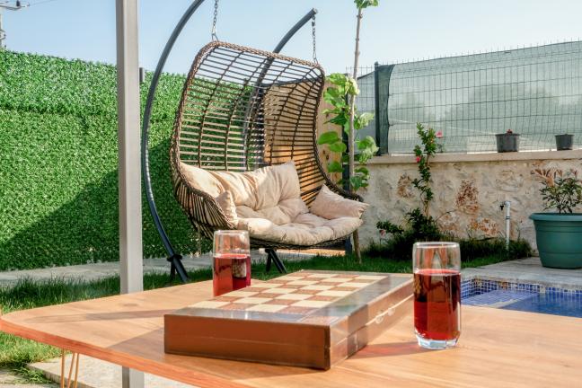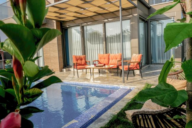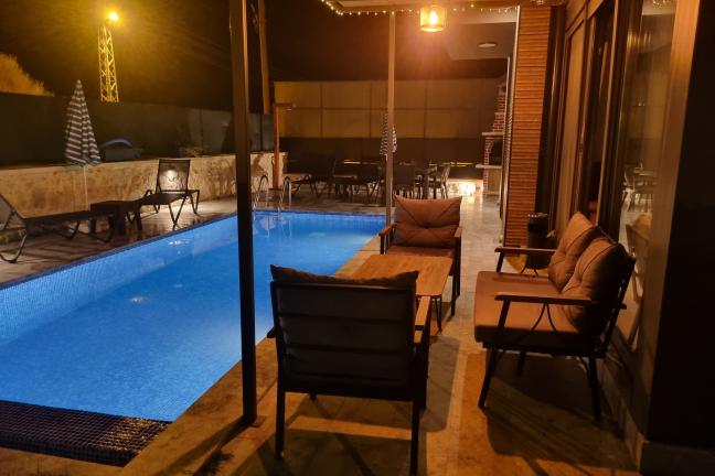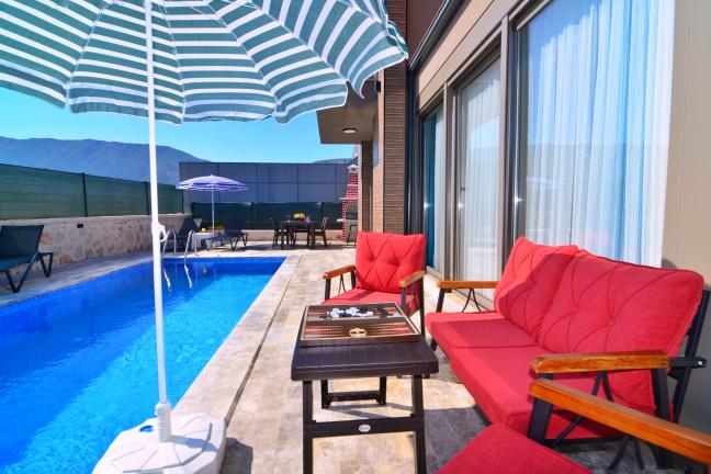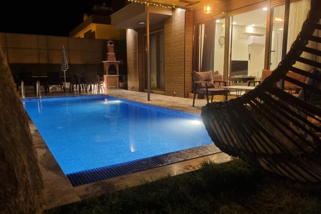 Havuz terasında özel yüzme havuzu, şezlonglar, güneş şemsiyesi, masa ve sandalyeler, salıncak, mangal bulunmaktadır.