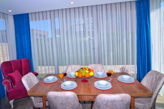 Oturma grubu, uydu alıcı, televizyon, klima, elektrik süpürgesi, havuz alanına çıkış bulunmaktadır.