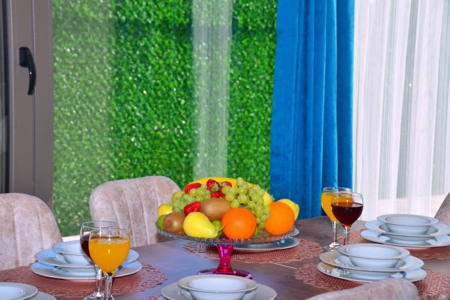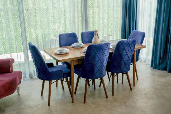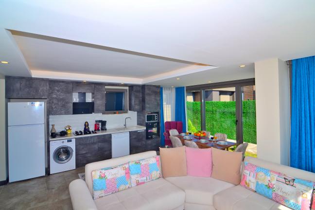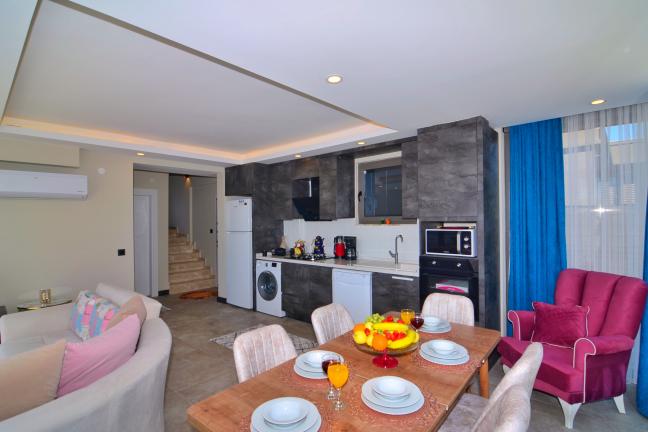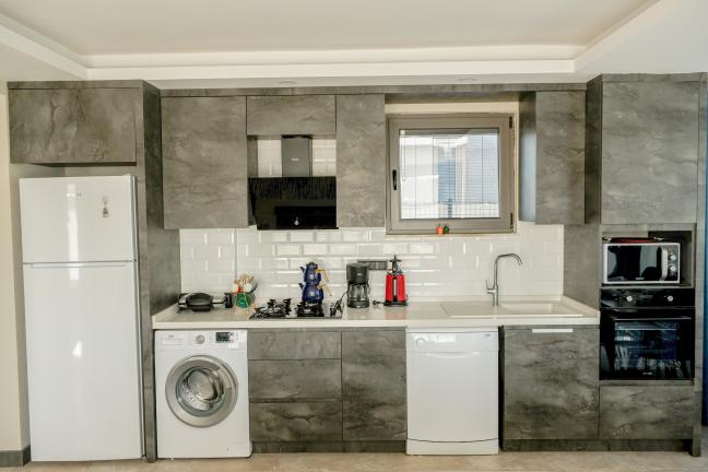 Modern Amerikan mutfak, buzdolabı, bulaşık makinesi, ankastre fırın, ankastre 4’lü ocak, elektrikli su ısıtıcısı (kettle), 4 kişilik yemek takımı, çeşitli mutfak araç gereçleri, yemek masası ve sandalye bulunmaktadır.