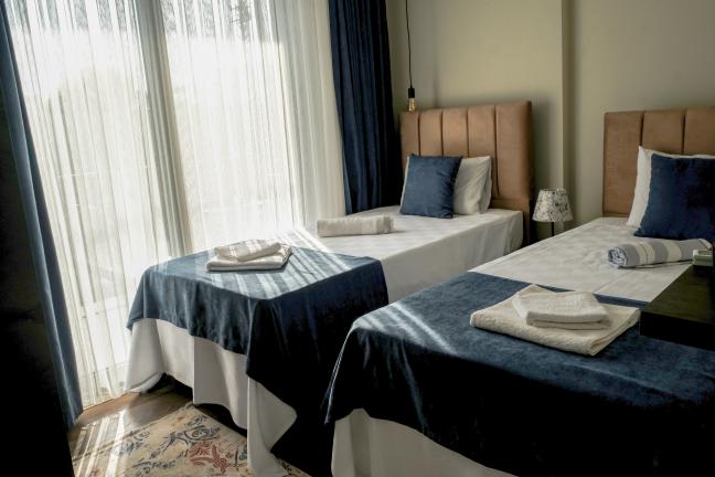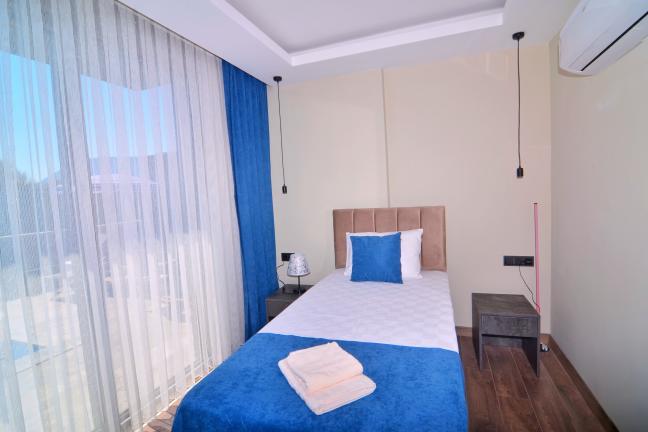 3. Yatak Odası: 1 Adet çift kişilik yatak, klima, elbise dolabı, komodin, havuz alanına çıkış bulunmaktadır.