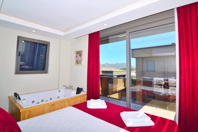1. Yatak Odası: 1 Adet çift kişilik yatak, klima, elbise dolabı, komodin, jakuzi, tuvalet ve banyo bulunmaktadır.