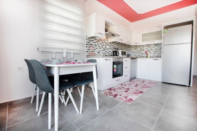 Amerikan mutfakta buzdolabı, bulaşık makinesi, çamaşır makinesi, fırın, 4'lü ocak, mikrodalga fırın, elektrikli su ısıtıcı (kettle), yemek masası, yemek takımları, çatal ve bıçak takımları, tencere ve tava takımları, bardaklar bulunmaktadır.