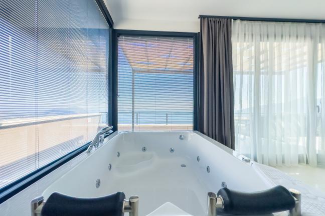 Detayları: Çift kişilik yatak, Elbise dolabı, Komodin, Klima, Giyinme odası, Deniz manzaralı balkon, Jakuzi, Sauna, Türk hamamı ve Balkonda oturma grubu mevcuttur.