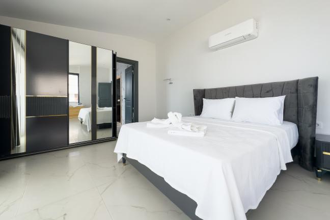Detayları: Çift kişilik yatak, Elbise dolabı, Komodin, Klima, Giyinme odası, Deniz manzaralı Balkon bulunmaktadır.