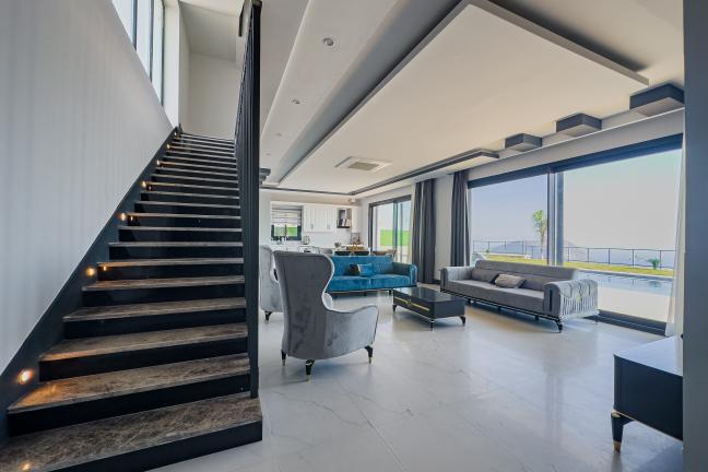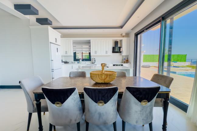 Villamız Kalkan merkeze 2 km ve denize ise 4 km mesafede yer almaktadır. Modern mimarinin en güzel örneklerinden biri olan bu villamız ; teras katında harika bir deniz manzarasına sahip olup, keyif dolu zamanlar geçireceğiniz oturma grubu mevcuttur. Teras katındaki suit aile yatak odasında 1 Adet jakuzi, sauna odası ve hamam bulunmaktadır. Villamız eşsiz manzarası, merkezi konumu, ayrıcalıklı mimarisi ve ferah kullanım alanlarıyla balayı çiftleri ve kalabalık aile grupları içinde ideal bir tercih sebebi olabilir.